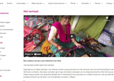 SJAAL MET VERHAAL creëert werk voor vrouwen in Nepal, handmade, fairmade, fairtrade. Niet alleen sjaals, maar ook vloerkleden, onderzetters, sieraden, tassen en allerlei vilten decoraties. Kleurrijk, uniek en handgemaakt. Werk voor inmiddels meer dan duizend vrouwen in Nepal en Thailand. Economisch zelfstandigheid heeft een enorm positieve impact op hun leven. SJAAL MET VERHAAL is een Social Enterprise, een onderneming die het maken van winst niet als doel heeft, maar als middel voor het bijdragen aan een betere wereld.