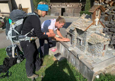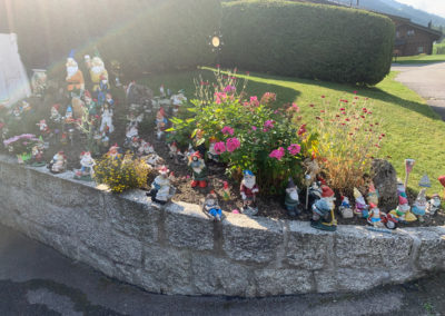 We lopen in het zonnetje door een prachtig versierd dorp met thema tuinkabouters. Het lijkt de Vierdaagse van Nijmegen wel met zo’n themadorp onderweg. De helling die we daarna beklimmen maakt echter meteen duidelijk dat we ons echt in de bergen bevinden, zo pittig.