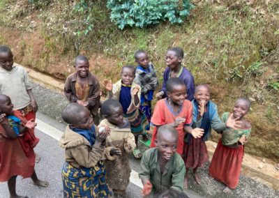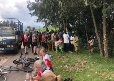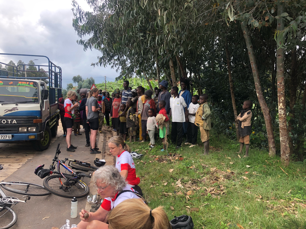 Tijdens de lunch werden wíj het uitzicht. Een steeds grotere groep mensen verzamelden zich om ons heen. Even verderop stond een groep kinderen die wel een banaantje van ons wilden. Marthe, projectbegeleider van Sevota die met ons meereist, vond dat ze eerst een liedje mochten zingen. En dat deden ze! Blijkbaar was het nieuws van onze toer al vooruit gesneld, want verderop kwamen we langs een school, waar alle klassen en de leraren ons vanaf de helling stonden toe te zwaaien en aan te moedigen!