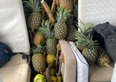 Bij volgende groepen zullen we nog meer fruit krijgen, het stapelt zich op achter in de bus, we kunnen een handeltje beginnen.
