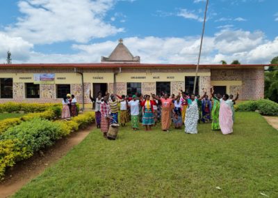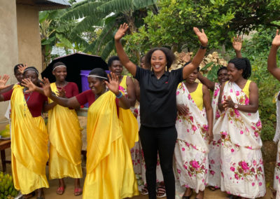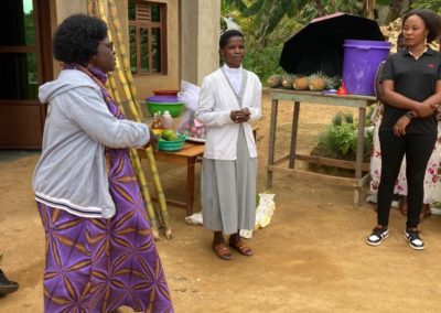 De eerste vrouwengroep zit in Hanika. Het welkom is hartverwarmend: zo’n 15 vrouwen in prachtige jurken zingen en dansen ons welkom. Soeur Beatrice van parochie Hanika, Ferediana, gepensioneerd docente, en Agathe, groepsleider, doen het woord. De groep huurt land en teelt daarop fruit, o.a. ananassen. Ze laten zien hoe ze de ananassen met de hand persen. Ze maken ananassap en ananasbier. Dat bottelen ze in tweedehands flesjes en verkopen dit op de markt. Van Melania hebben ze geld gekregen om een persmachine te kopen om zo de productie te vergroten. De machine moet nog gekocht want ze willen een grotere dan eerst bedacht. De 280.000 RWF hiervoor hebben ze nog net niet bij elkaar.