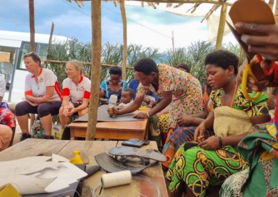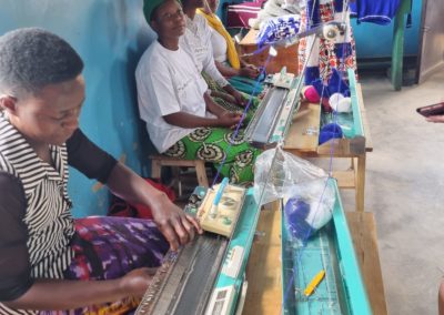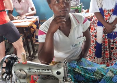 Bij parochie Hanika ontmoeten we verschillende groepen. Na weer zo’n uitbundig welkom met zang en dans zien we een groep aan het werk in een naaiatelier.
