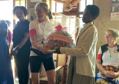 Een dag vol met veel bezoeken aan ondernemende vrouwengroepen. Maar eerst fietsen: zo’n 37 km en 800 hoogtemeters langs het Kivumeer. Zwaar, maar veel te zien onderweg: prachtige uitzichten over het Kivumeer en veel levendigheid van mensen en dieren langs de weg. Zoals koeien: een koe die keurig het zebrapad oversteekt, een plassende koe waarvan we het opspattende vocht nog net ontwijken, een losse koe die de helling afrent met zijn eigenaar erachteraan. We zien mensen met aangelijnde geiten en net geslachte kippen. En overal worden we weer enthousiaste begroet en aangemoedigd. We rijden verkeerd en moeten terug, de lange helling die we omhoog gezwoegd hebben mogen we weer afdalen.