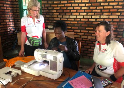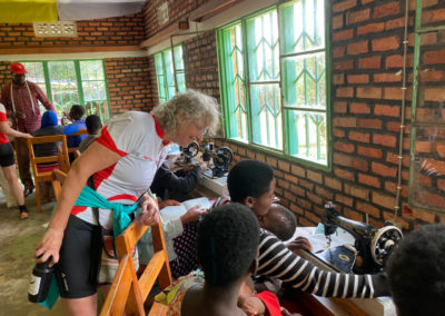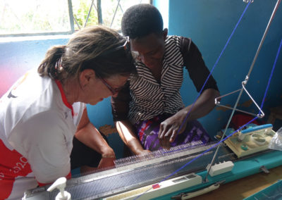 We komen in een ruimte waar zo’n 20 vrouwen aan het vlechten en naaien zijn. Ook zien we de borduurmachine die met steun van Melania is aangeschaft. Hiermee kunnen ze ook kleding met opdruk maken. Heel handig voor schooluniformen.