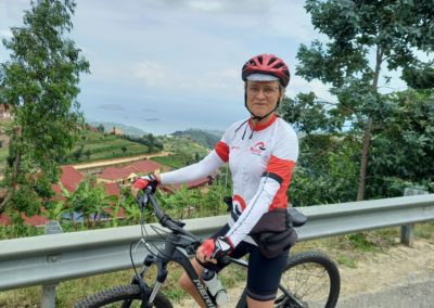 We stappen vroeg weer op de fiets en rijden langs het Pivomeer richting het noorden naar het plaatsje Rutsiro. Er staat een fris windje. We zien het inmiddels vertrouwde landschap van groene heuvels met bananenbomen, vriendelijke mensen aan de kant en zo nu en dan een glimp van het meer. Onderweg komen we twee jongens op 1 racefiets tegen die ze delen. Het blijken vrienden te zijn van onze mecanicien. Ze rijden een stukje met ons op.