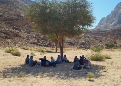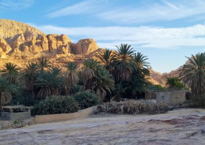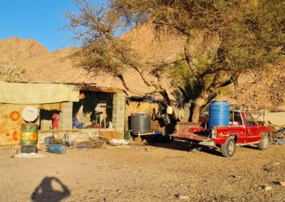 In de namiddag lopen we langs de oma en opa van Mohammed. In the middle of nowhere treffen we een kleine habitat aan waar wat schapen, een kameel en duiventil het enige levendige lijken te zijn. Binnen in een kleine ‘hut’ worden we warm ontvangen door de opa en tante met nichtje van drie. Zoete thee wordt geserveerd en ‘souvenirs for sale’ komen te voorschijn. We kopen wat en worden vriendelijk weer uitgezwaaid. Later, onderweg naar onze slaapplaats lopen we Mohammed’s oma tegen het lijf. Ze lacht ons warm toe, al zie je haar denken: ‘wat bezielt deze elf vrouwen….’