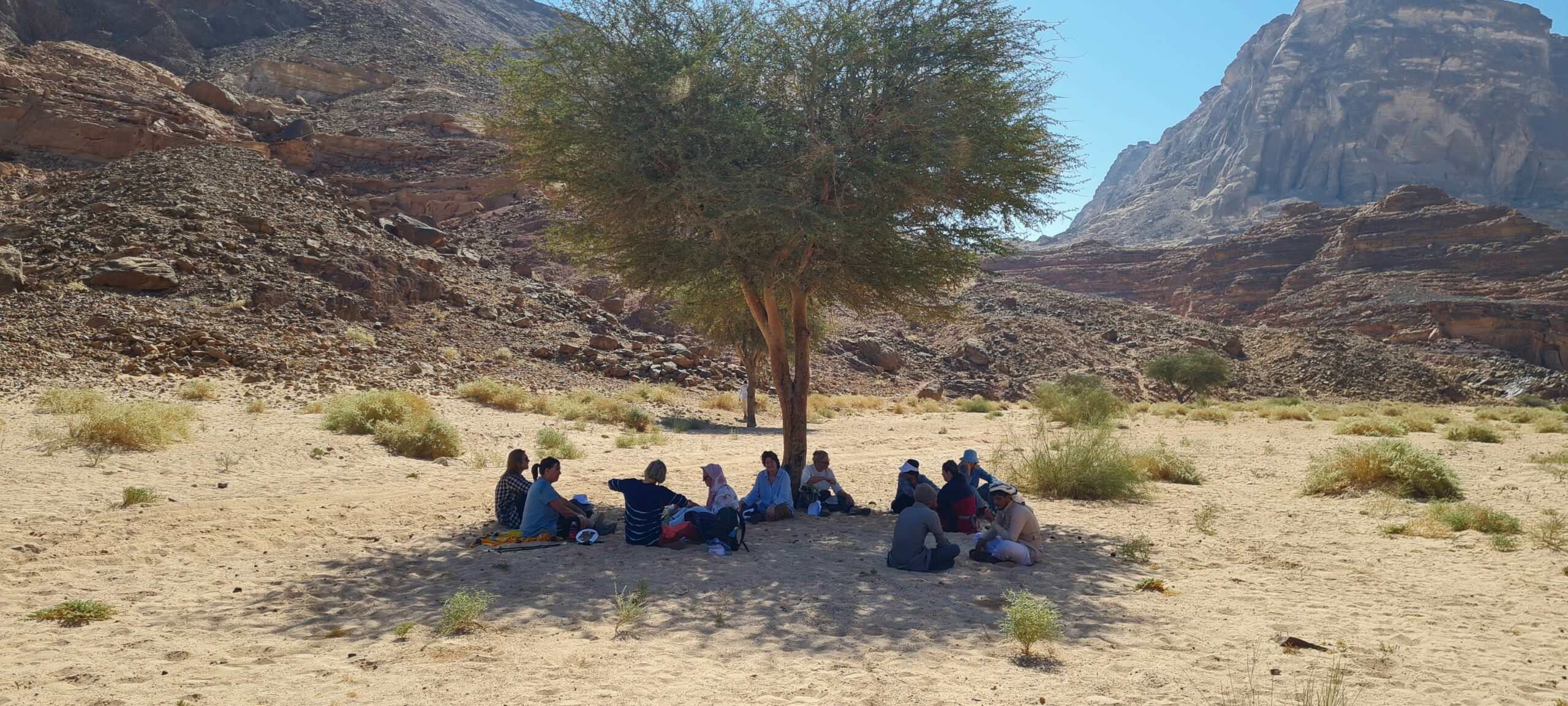 Onderweg blijven we ons verwonderen over de wijdsheid, het ruige rotsige naast het eindeloze zand. We lunchen halverwege op een fijne schaduwplek tegen koele rotsen met flatbread, aubergine, bonen en heel veel thee.