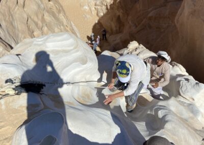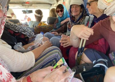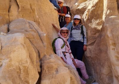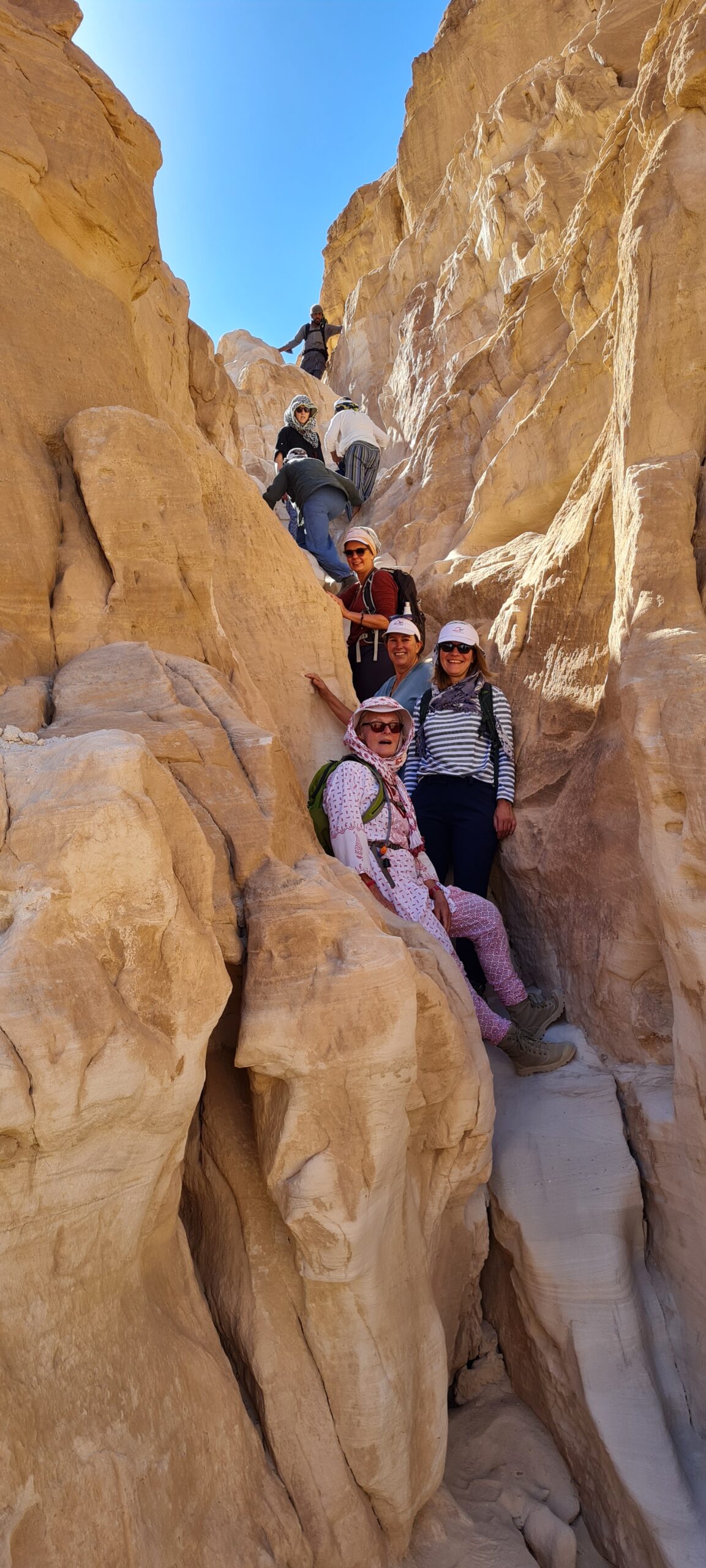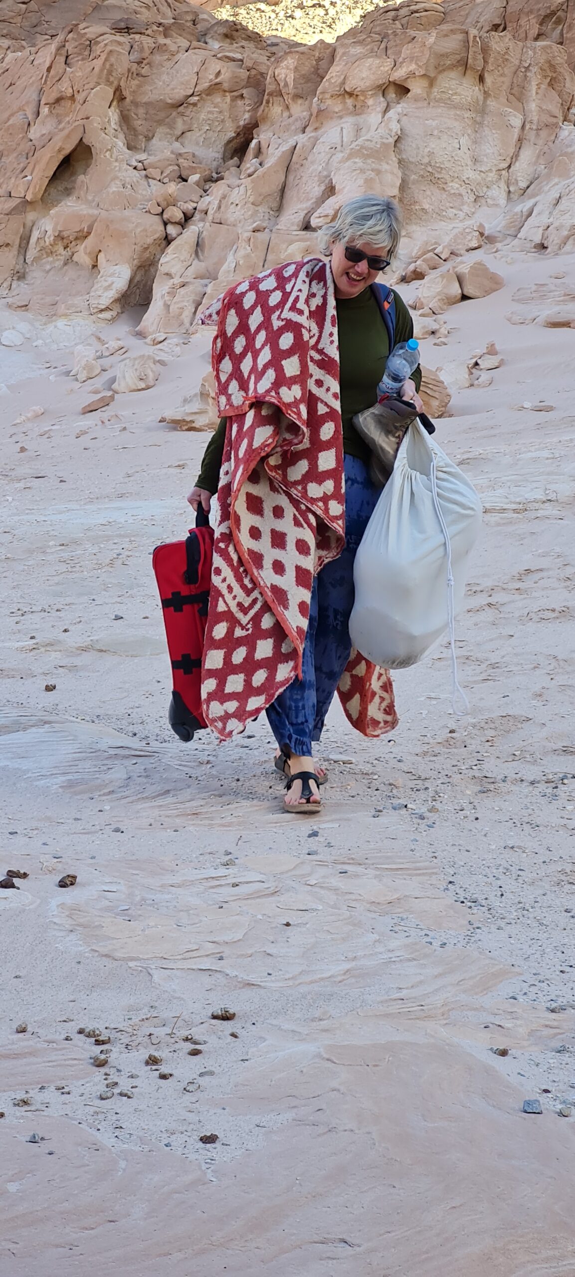 Nagenietend van het eten en de verhalen die we met elkaar delen lopen we weer verder door het steeds afwisselende landschap. Weids, dan weer smal, rotsen, zand met harde dan weer zachte ondergrond. Een lang lint van 11 vrouwen, 1 gids, 6 Bedoeïenen (jonge mannen) en 6 kamelen trekt verder door de woestijn. Veel eerder dan gepland komen we op de plaats van bestemming en worden we verwelkomd met een heerlijk glas koud mangosap. Nu hebben meer tijd voor onszelf, elkaars verhalen te horen over ieders uitdagingen in het leven en te fantaseren over welke uitdagingen ons morgen te wachten staan.