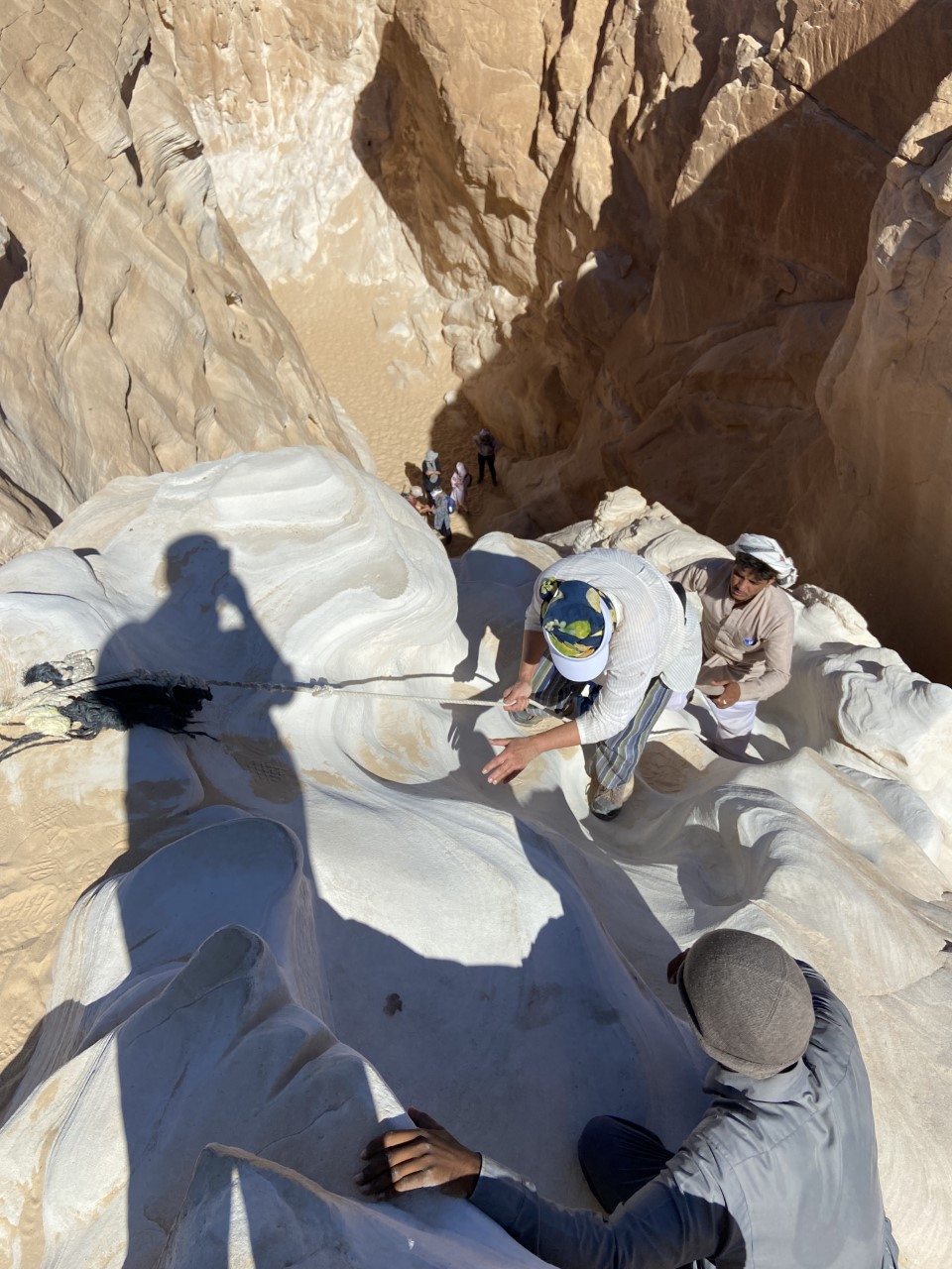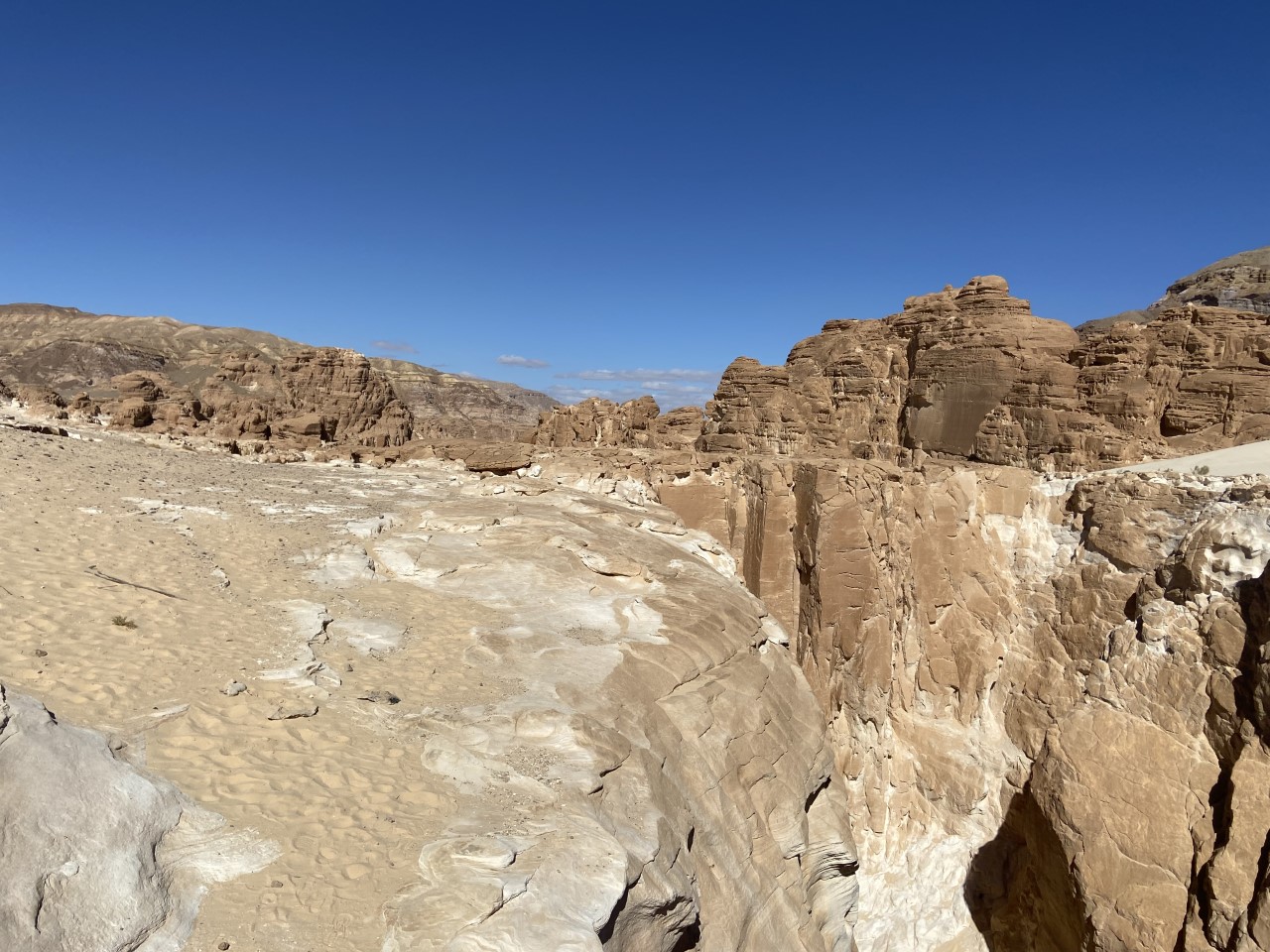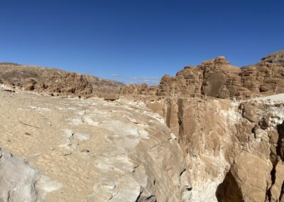 Door de Wabi vallei, lopen we richting de volgende uitdaging. Via een zeer smalle, steile klim komen we in de zogenoemde White Canyon, die ik in eerste instantie minder wit vond dan gedacht, totdat iemand tegen mij zei dat ik misschien even mijn zonnebril moest afzetten. Dit maakt het verschil!