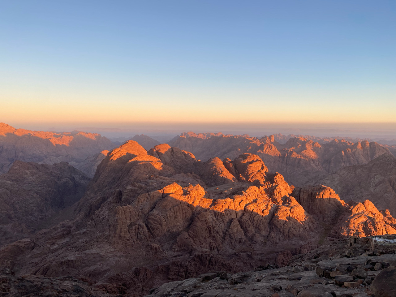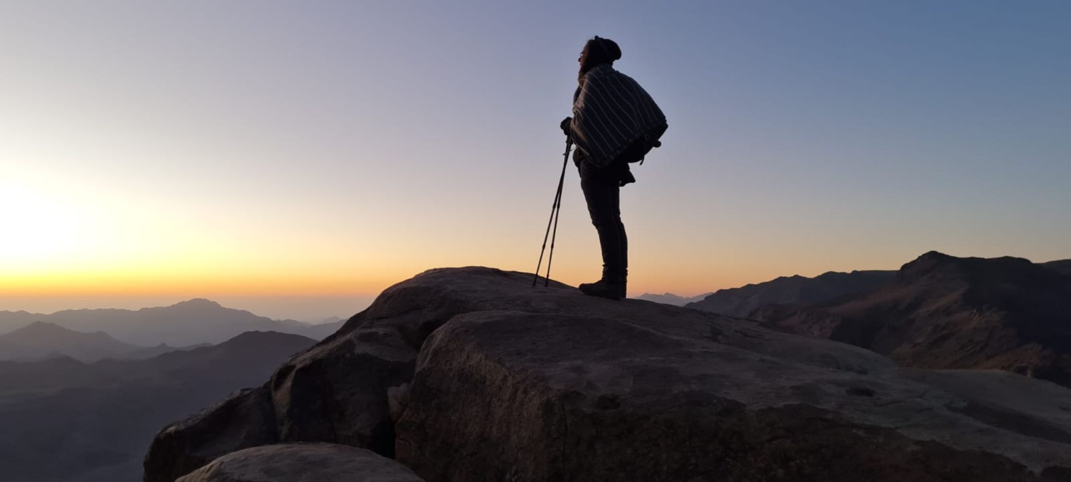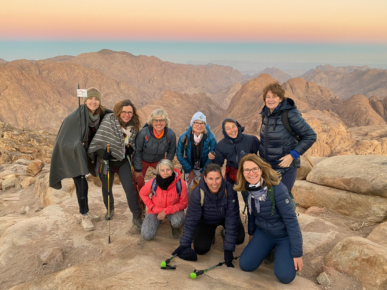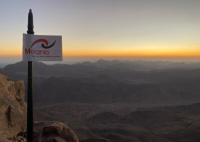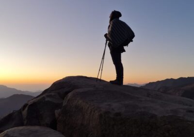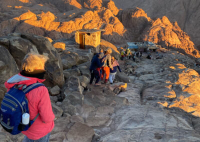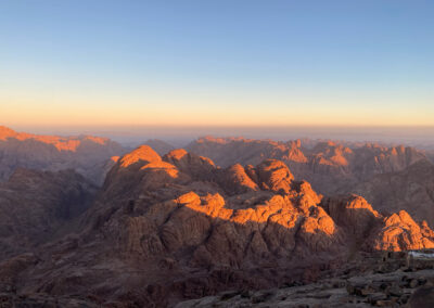 De nacht is kort. Om 01.00 uur gaan we dik gekleed tegen de kou op pad, om 01.30 uur starten we onze tocht naar boven, de Mozesberg op. Ons pad wordt beschenen door onze eigen mijnwerkerslampjes, maar al snel vraagt de gids om deze uit te doen. De rest van het pad beschijnt het sterrenbeeld Orion en de maan onze weg. Orion heeft ons deze hele reis vergezeld, samen vele andere sterren aan de hemel. Langzaam slingeren we achter elkaar de 7 km hoge berg op, door het prachtige landschap. We wanen ons in de tijd van Mozes. Een lange rij kamelen over de kam van de berg, belicht door de sterren in de Sinaï, op weg naar de twee stenen tafels met de tien geboden.
