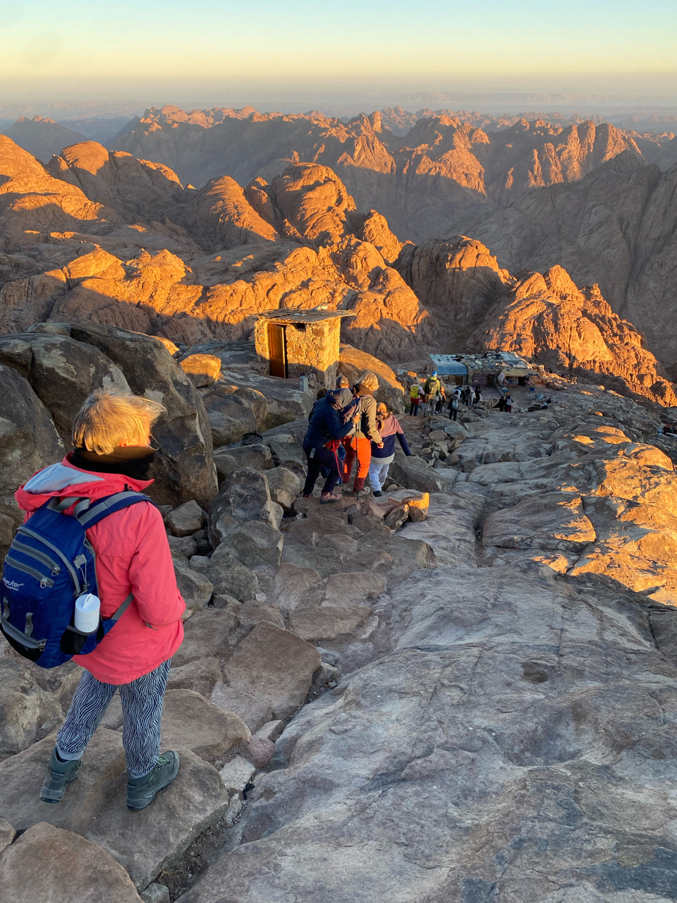 Het eerste deel van ons pad is redelijk begaanbaar, maar op driekwart verandert het en blijven de kamelen achter en moet iedereen te voet verder. Hoewel we gekleed zijn tegen de kou, staat het zweet op onze rug. We klauteren moedig voort. Zo komen we ook langs verschillende koffietentjes waar je even op adem kunt komen. Het laatste uur worden onze klimgeitvaardigheden getest. We klauteren stap voor stap over rotsblokken. Onze gids wilde dit gedeelte eigenlijk niet mee omdat hij te moe was, maar hij kon de groepsdruk niet weerstaan en gaat toch met ons mee. Het lijkt er even op dat we bijna te laat zijn voor de zonsopgang, omdat we op advies van een koffietenthouder lang in zijn warme tentje bleven zitten maar gelukkig is dit net niet het geval. Samen met honderd anderen zien we de lucht verkleuren, prachtig blauw, roze. De zon komt langzaam op en beschijnt het gebergte. Indrukwekkend.