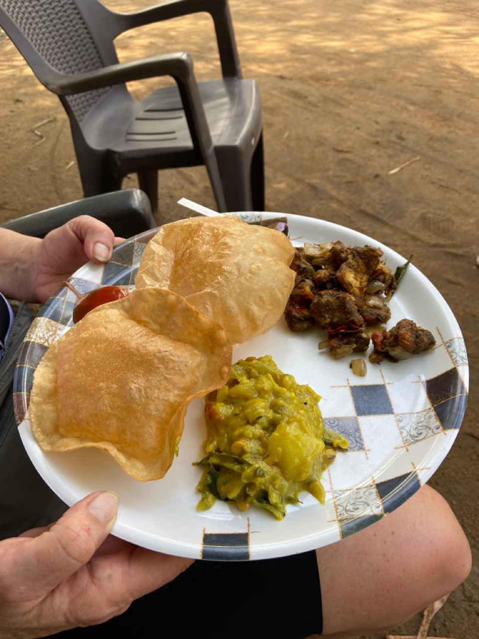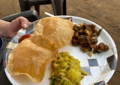 Het is bijzonder om in India te fietsen maar ook erg druk en het landschap is niet echt mooi. Wel wordt na 35 km een prachtige plek onder de palmbomen gevonden waar we lunchen. Het duurt wel even voor het eten is bereid in de foodtruck, want ’10 minuten’ betekent doorgaans ruim een uur. Maar het is het wachten weer waard!