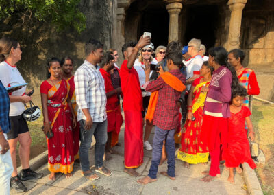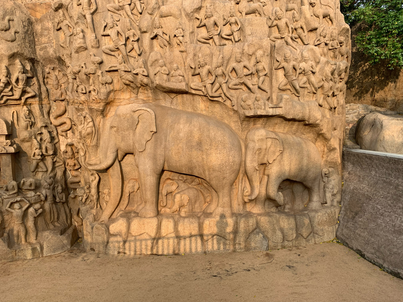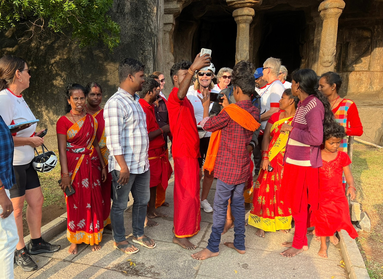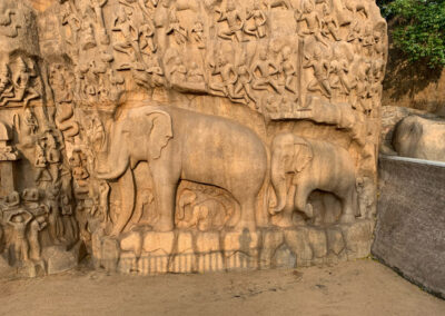Dag 4 – Om 06.30 uur gaat de wekker en om ongeveer 08.00 uur stappen we op de fiets. Op naar de eerste bezienswaardigheid van vandaag: de archeologische site Mahabalipuram. Het bestaat uit een groep van zeer oude granieten monumenten. Onze tolk en fietsgids vertelt, aangevuld door onze chauffeur, van alles. Het is interessant en we zijn blij dat we dit onderdeel van het programma toch niet hebben geschrapt.