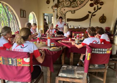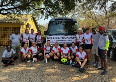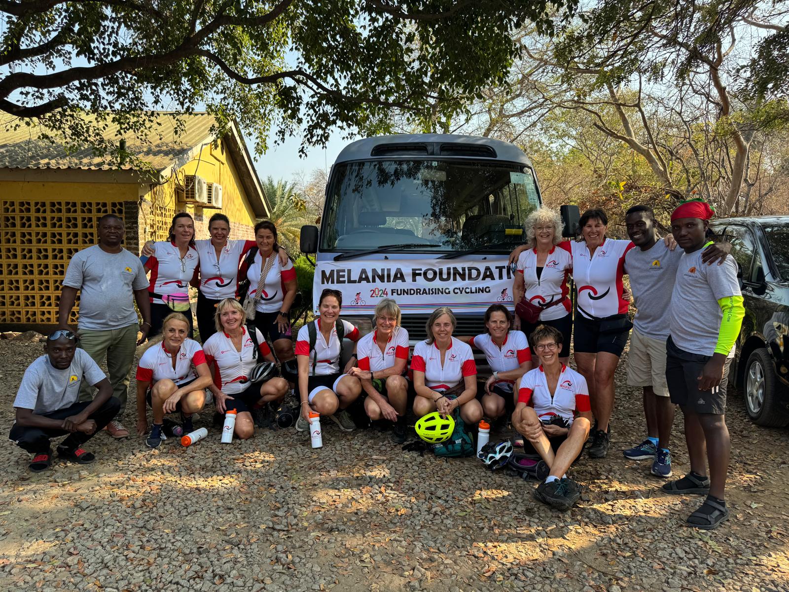 EERSTE FIETSDAG – Na het ontbijt onder de bloeiende bomen van de lodge, is het tijd voor de groepsfoto in fietskleding.