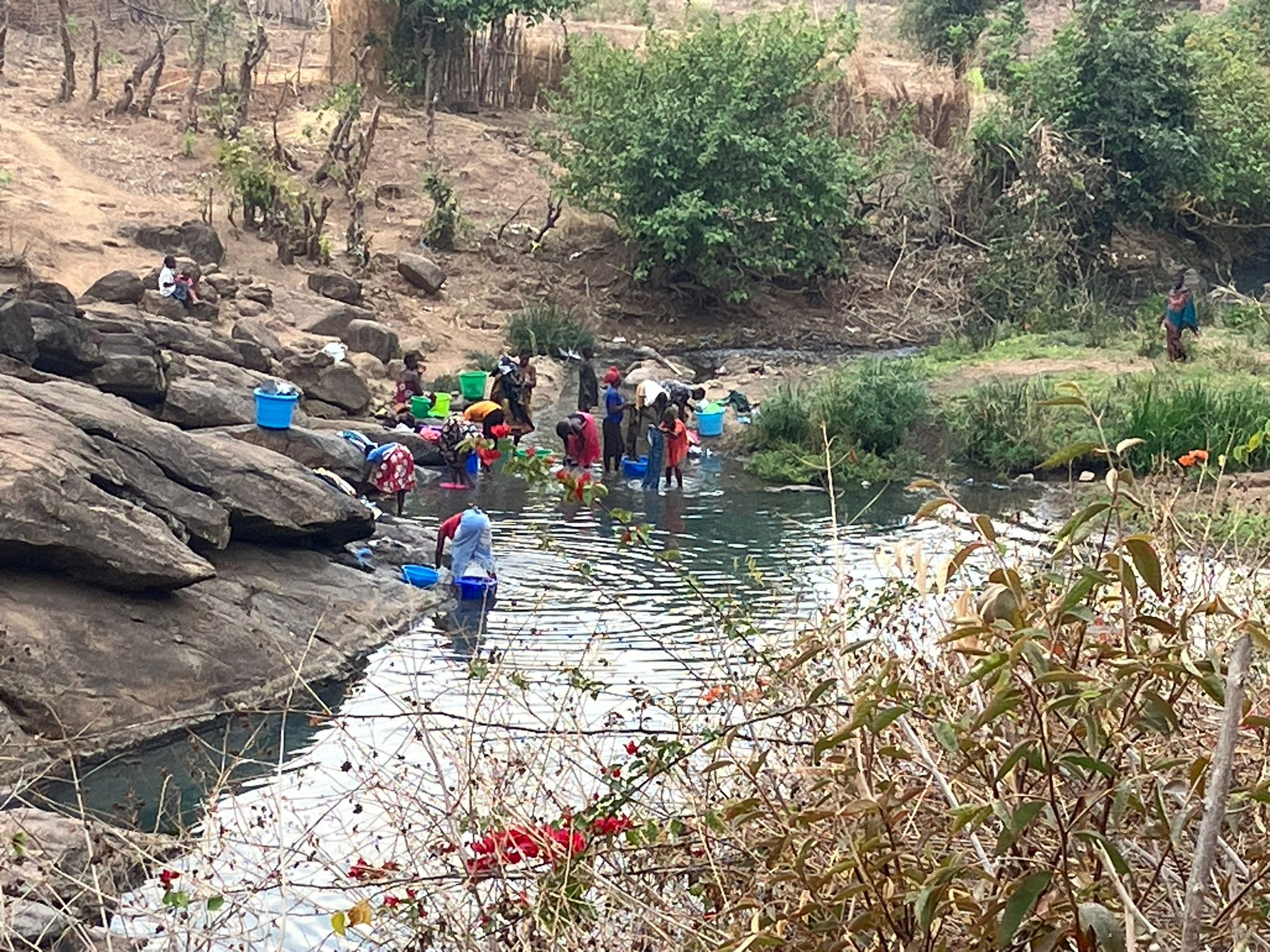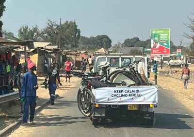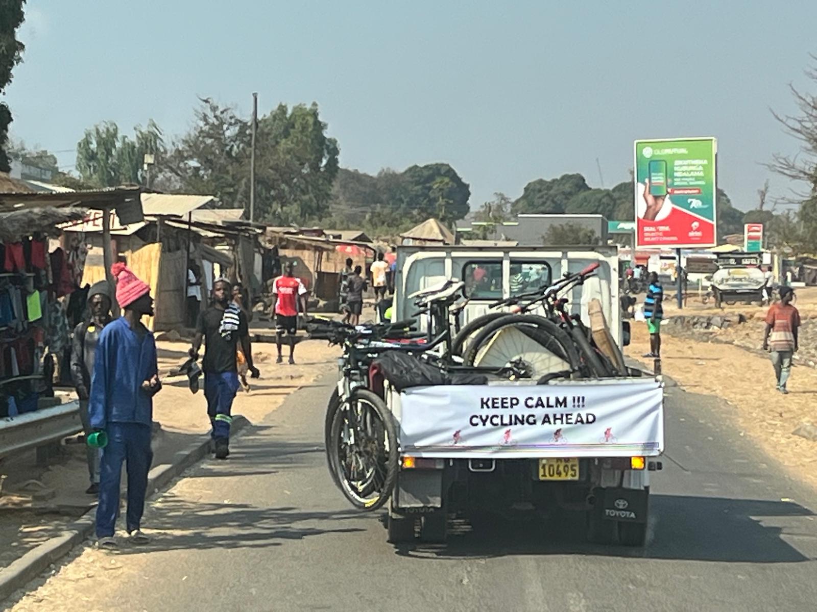 Daarna snel in de bus omdat het al 30 graden is. We rijden tot net buiten het levendige plaatsje Salima. Veel mensen langs de weg, kinderen roepen ons toe en geiten scharrelen rond. Net buiten het stadje stappen we op de fiets. De weg, een van de weinige hoofdwegen in Malawi is redelijk rustig. Het is wel opletten met alle gaten in de weg. En de hitte is heftig, het kwik loopt op tot zo’n 35 graden. Veel drinken en tussendoor stoppen dus.