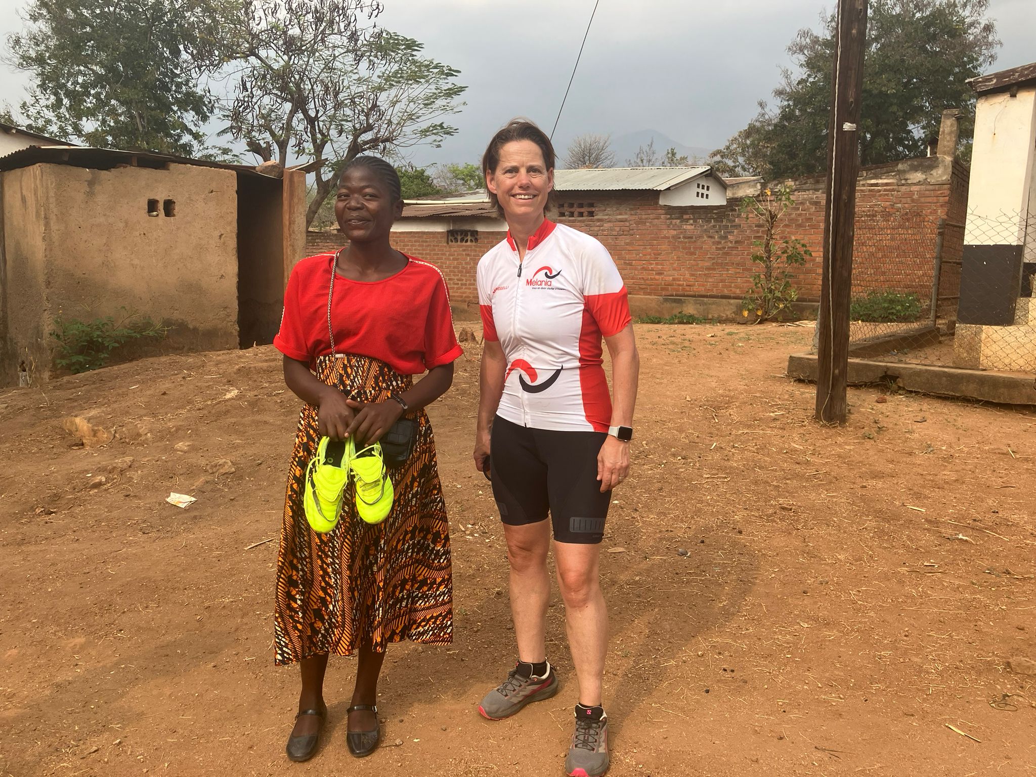 TWEEDE FIETSDAG – Een dag vol verrassingen! Het programma bestond vooral uit ontbijten, een stukkie met de bus en een stukkie fietsen. Maar bij het vertrek van Kungoni Cultural Centre bleek dat de aanvoerster van het voetbalteam lopend naar ons onderweg was. Ze wilde ons nog graag bedanken voor alle voetbalschoenen, ballen en shirtjes die we voor hen hadden meegebracht. Dan kun je niet zomaar vertrekken. Met veel bedankjes en foto’s werden twee paar schoenen symbolisch overhandigd. Ze hebben beloofd een foto te sturen van het team in vol ornaat.