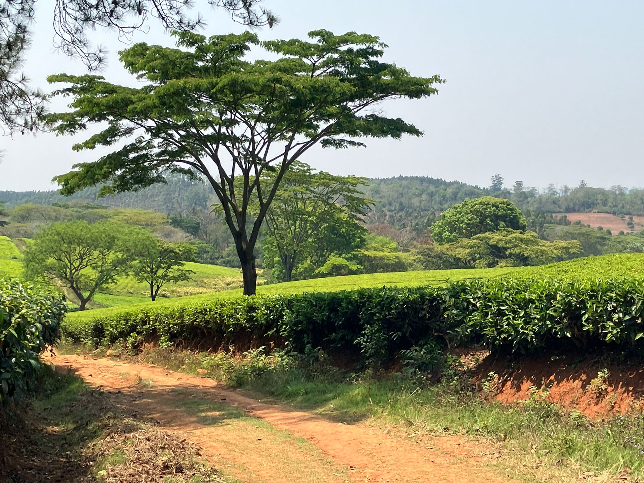 We beginnen met een stukje met de bus om de drukte van de stad te ontwijken en gaan op weg richting dirt road. Na Blantyre verandert het landschap snel in theeplantages. Als de bus ons afzet glijden we kilometers lang naar beneden door de plantages. Wat een ander landschap dan dat we tot nu toe hebben gezien. In de oneindige groene theevelden op de heuvels met mooie vergezichten, staan prachtige bomen. We fietsen zelfs door een stukje jungle heen.