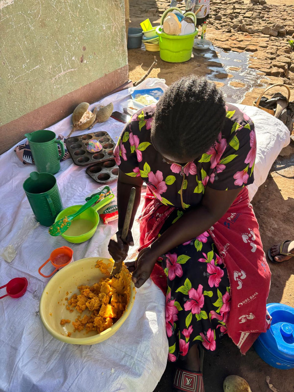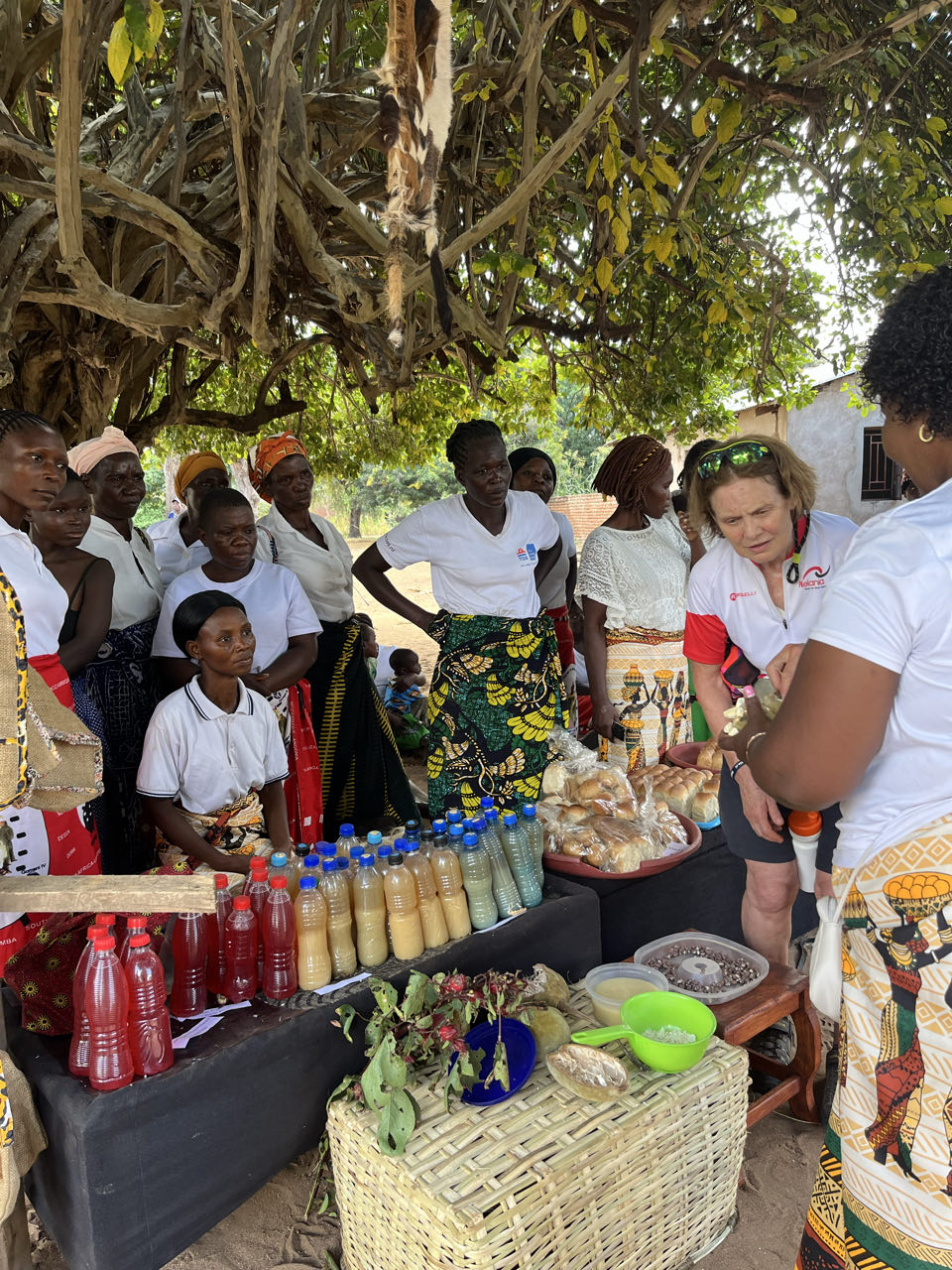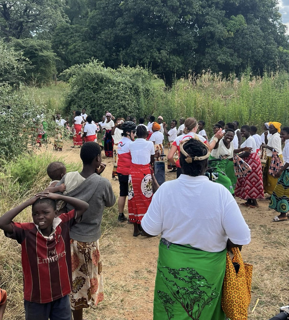 Daarna fietsen we 33 kilometer naar het dorp Chantulo. Meer dan 50 vrouwen wachten ons op straat op, zingend en dansend. Chief Chantulo verwelkomt ons met een toespraak en introduceert de 3 vrouwengroepen van het dorp. Ze laten vol trots hun producten zien, zoals sieraden, brood, kleding en baobabkoffie. Ze demonstreren ook hoe ze baobab-, zoete aardappel- en pompoenscones maken met hun zelfgebouwde oven in de grond. Een van de vrouwengroepen wil de productie van scones uitbreiden en zit met een nieuwe aanvraag in het proces bij Melania.