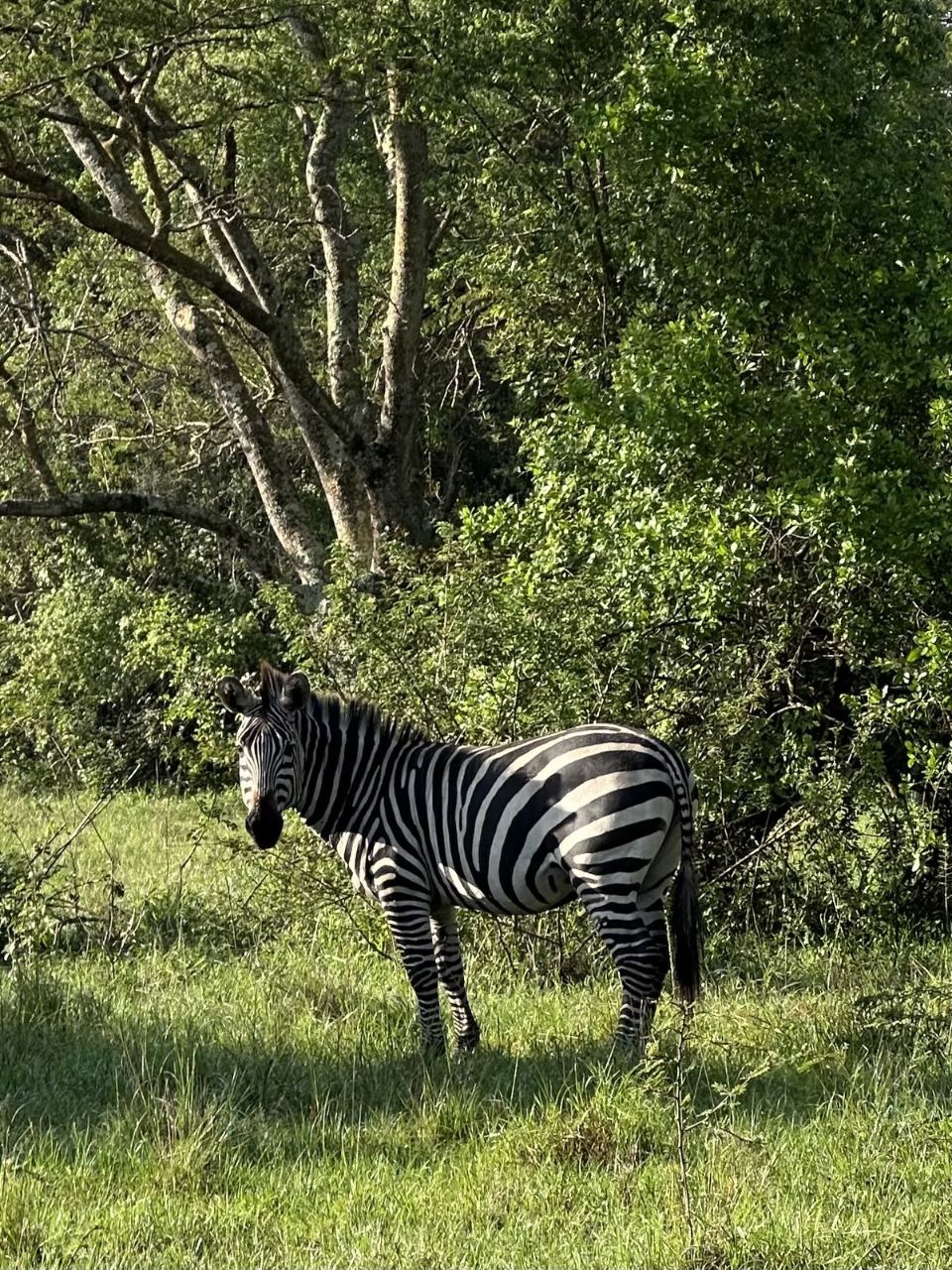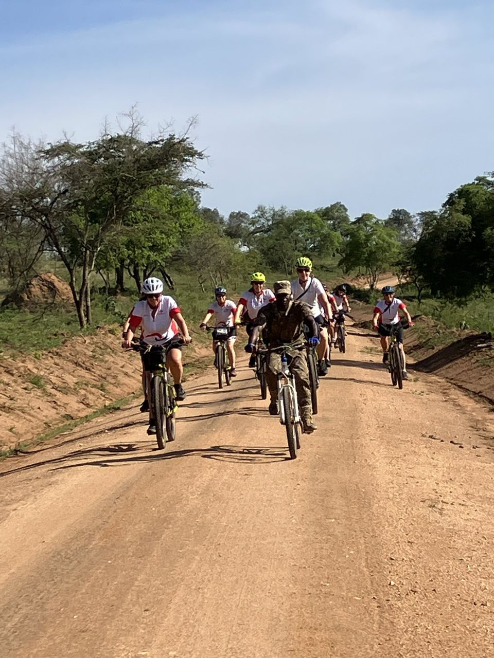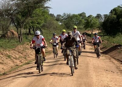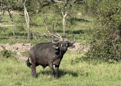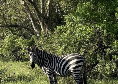 Vandaag staat een fietssafari op het programma door Lake Mburo park. Dus vroeg uit de veren en ontbijt om 06:30 uur. Onder leiding van ranger Aron maken we een ongelooflijke mooie toer met veel informatie. Het park is 370 vierkante kilometer groot en er zijn geen leeuwen, wel luipaarden, maar die jagen alleen ’s nachts. Veilig om te fietsen dus, maar voor de zekerheid draagt Aron wel een geweer met zich mee en roepen we onderweg de bus op om met het motorgeluid een nijlpaard te verjagen.
