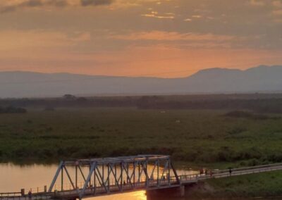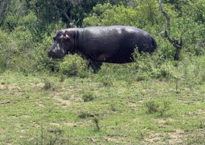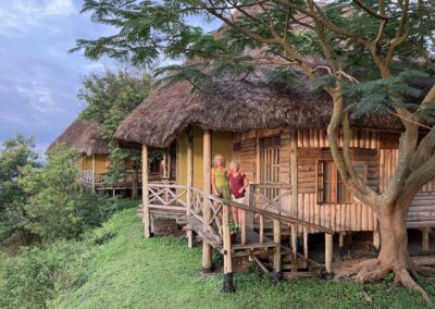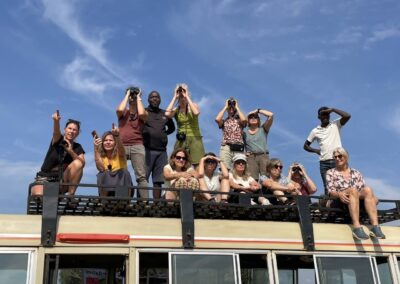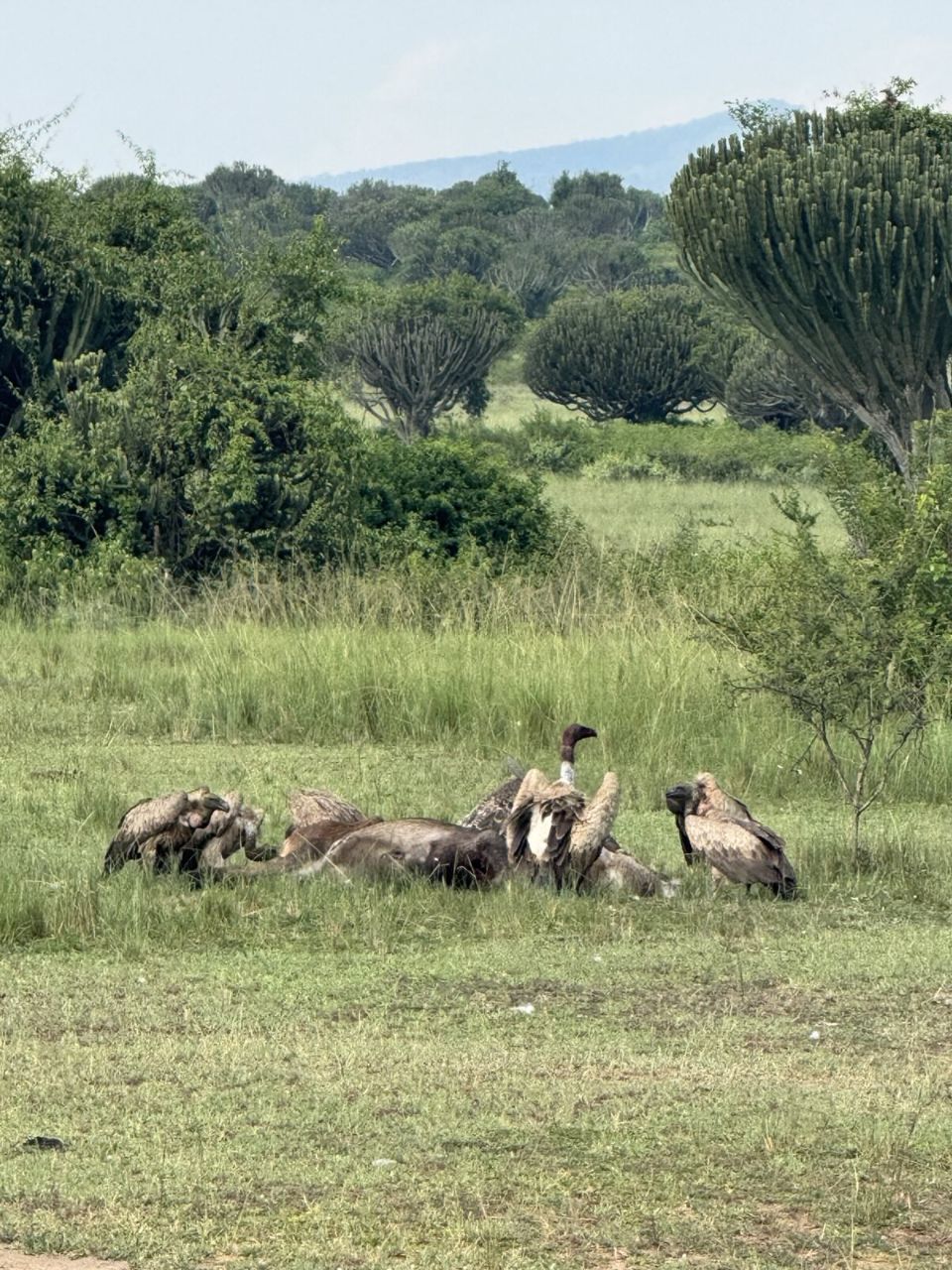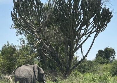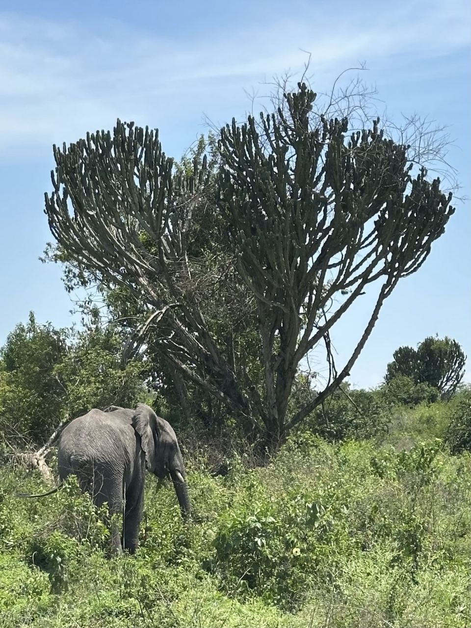 Terwijl de fietsen op het dak worden gehesen, ontspint zich een mooi gesprek met Fellie, de vrouwelijke manager van het hotel. In perfect Engels geeft ze ons meer zicht op hoe het is om in Oeganda vrouw te zijn. Als vrouw op eigen benen staan, wordt door de gemiddelde Oegandese man niet erg gewaardeerd. Als vrouw is het ondanks dat, of misschien wel juist daarom, belangrijk om voor je eigen geld te zorgen en daarmee zelfstandig te zijn. Weer wat wijzer en met de fietskleding aan, rijden we naar de westzijde van het park. Met zicht op olifantenfamilies langs weg- en waterkant. Steeds indrukwekkend!