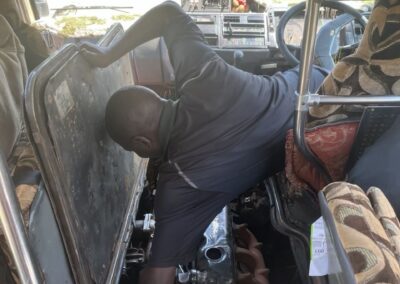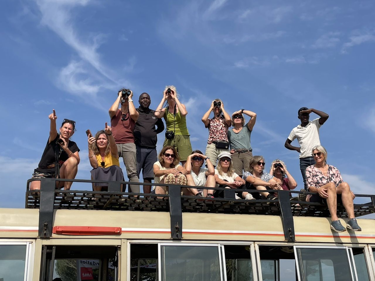 Met een sultan als leeuwengids in de bus kan dat niet missen, gaan we de leeuwen zien en misschien ook het luipaard. In onze eigen bus zonder veel vering, wordt het wel een rit met een flinke ‘Afrikaanse Massage’. Kakelend en schuddend, tot… Ja hoor, een rijtje jeeps bij elkaar. Daar, heeeel ver weg: leeuwen. Al snel staan twaalf vrouwen bovenop de bus te turen. En wat een cadeau: op de weg terug ook een luipaard, hangend in een grote cactus.
