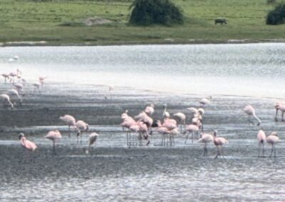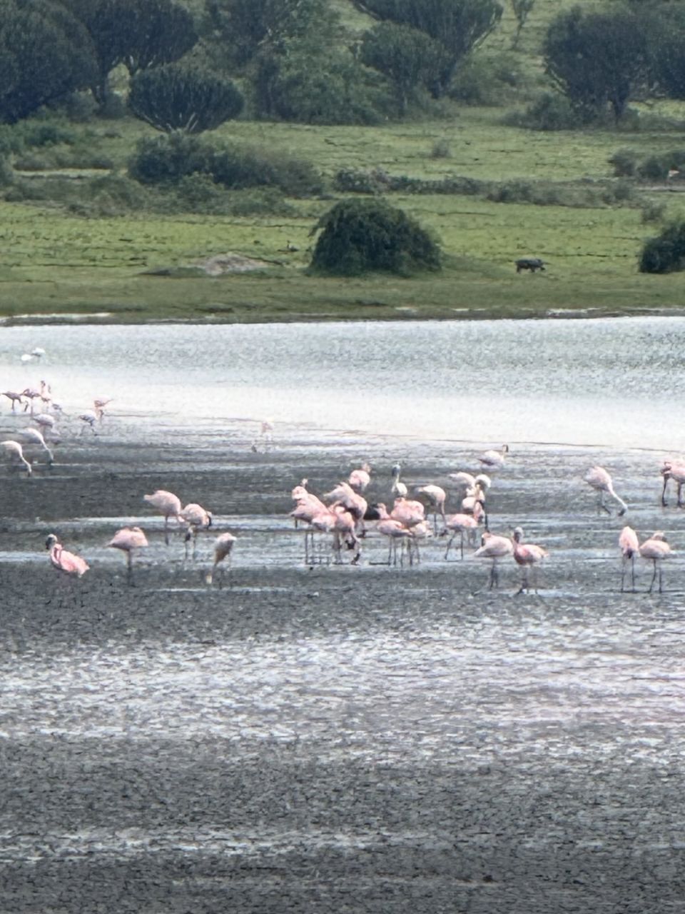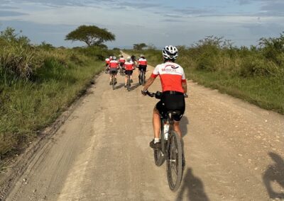 Het wordt een deels aangepaste, maar toch nog pittige route van 35 km over voornamelijk gravelroad. We fietsen langs een zoutmeer met talloze flamingo’s. Onderweg is het oppassen voor de steentjes en de olifanten, aldus de gids. En dat klopt als een bus: de steentjes kosten ons de eerste pleisters en de olifant die de weg oversteeakt hebben we met de bus als schild gepasseerd.