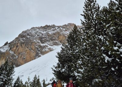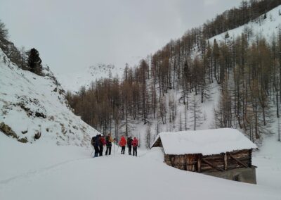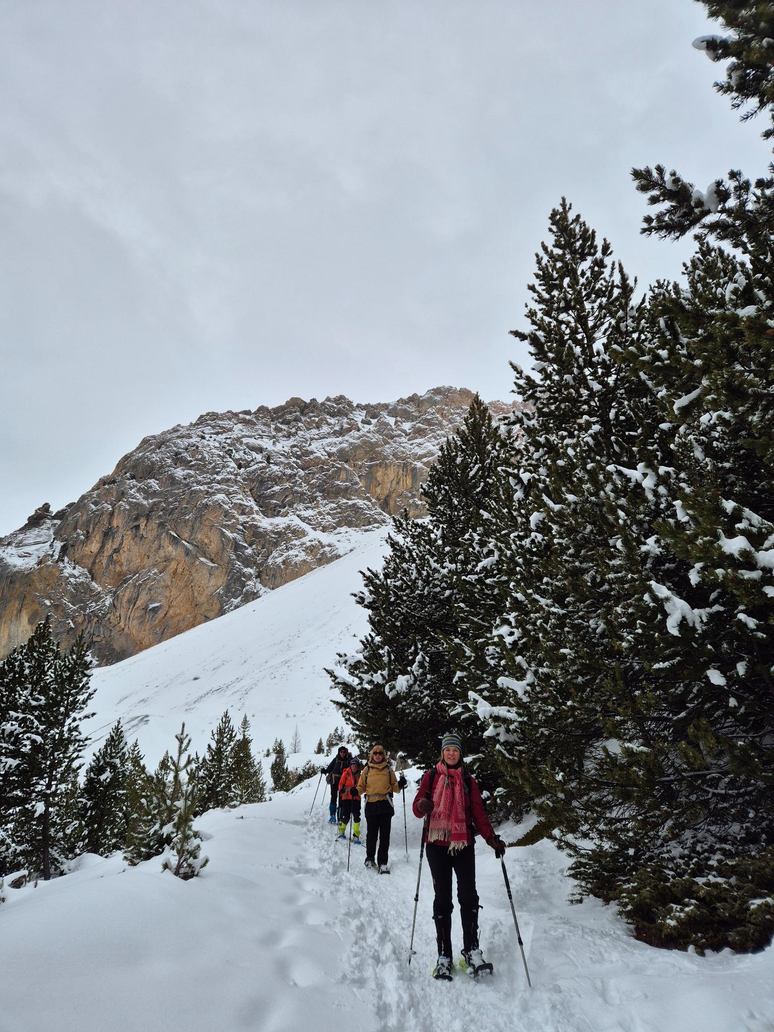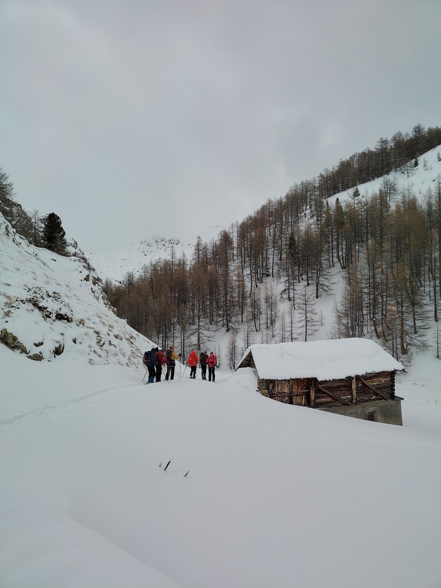 We doen ook wat lawine-oefeningen, zoals met afstand van elkaar lopen bij een bepaalde helling om het ‘risico te spreiden’. Met ander woorden: als er iets naar beneden komt, wordt er maar één iemand bedolven. Ook nog geoefend met de piepers waarbij één iemand de zender aan zette, en wij moesten gaan zoeken door het zoekknopje in te drukken. Gelukkig gevonden!