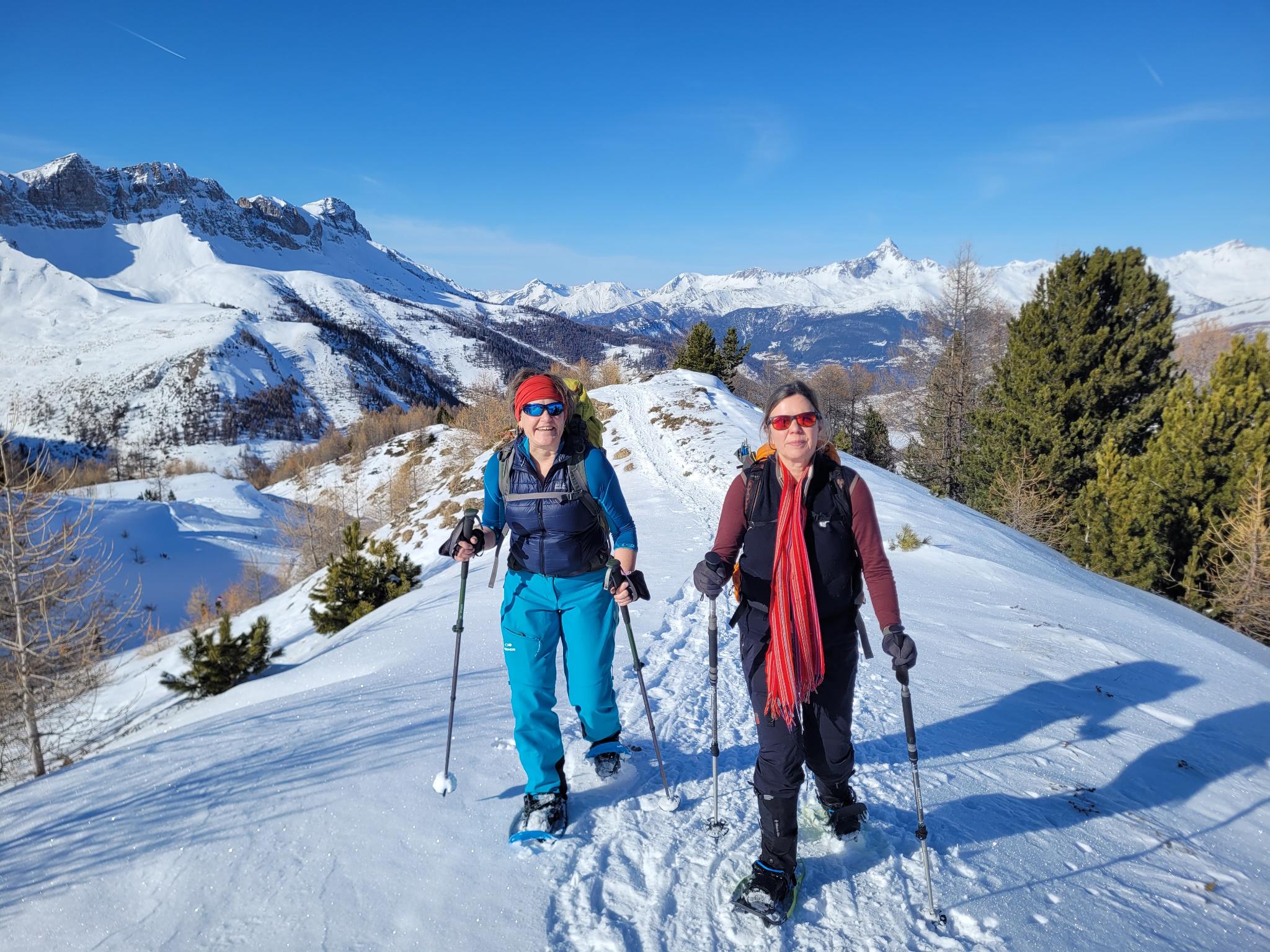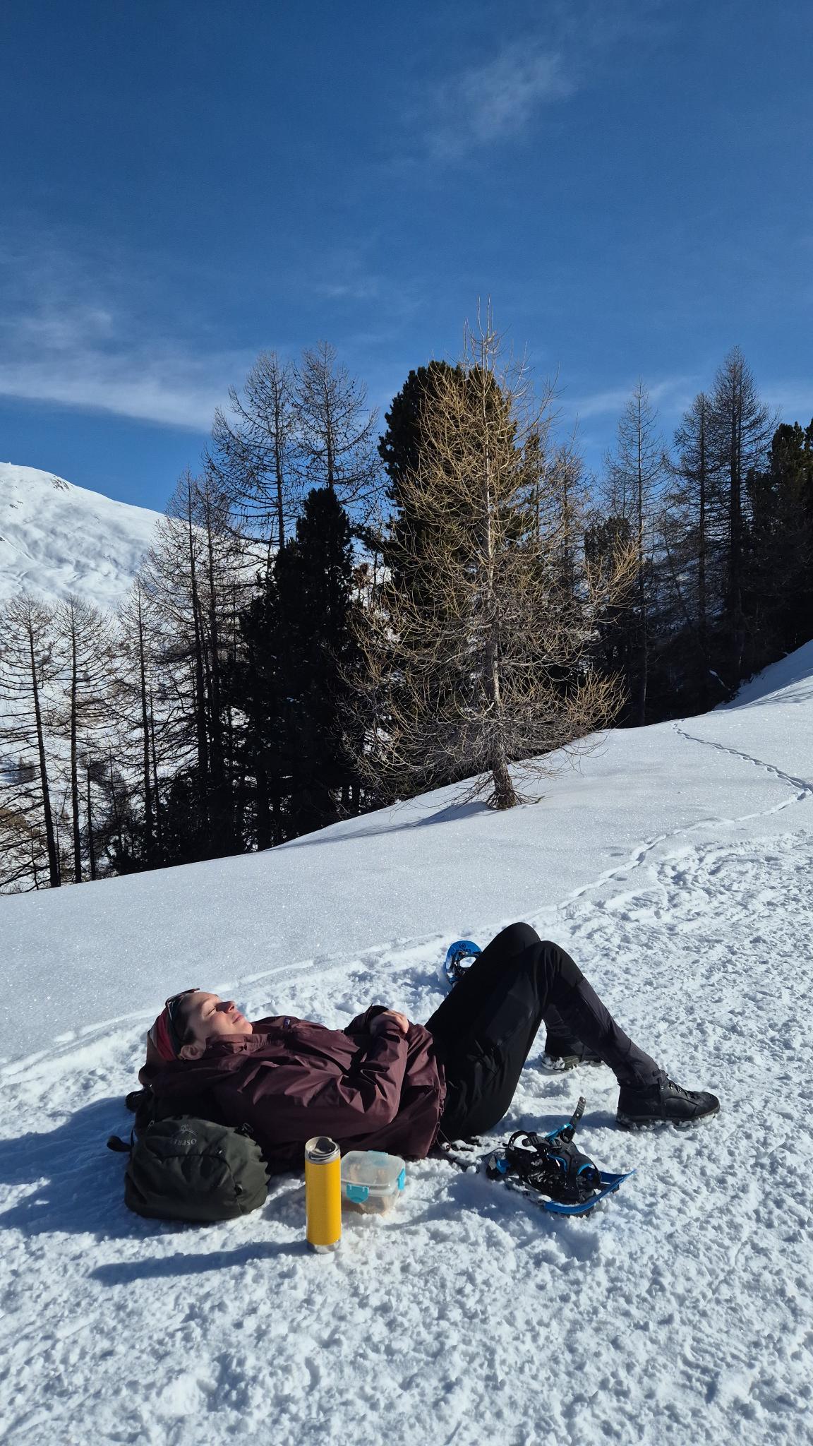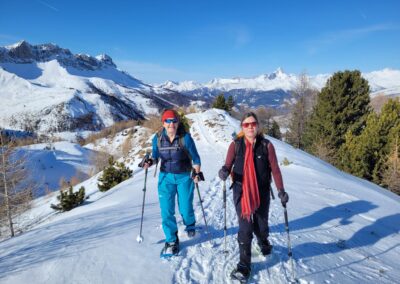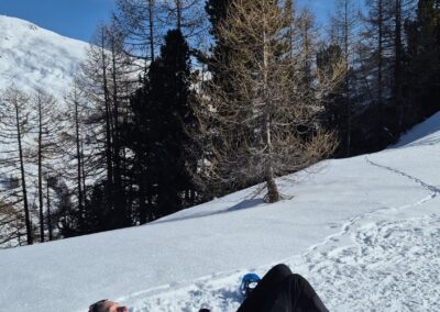 Na een klein uurtje pauze gingen we nog een stukje verder over de smalle graat met een schitterend uitzicht. De weg terug ging deels door de rulle sneeuw waarop nog een ijskristallen laagje lag dat schitterde in de zon. Na 3 dagen lukte het ons al beter om door de diepe sneeuw te huppelen maar je moet wel blijven opletten want je bent zo je evenwicht kwijt en dan is het lastig opkrabbelen uit de sneeuw.