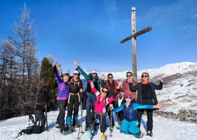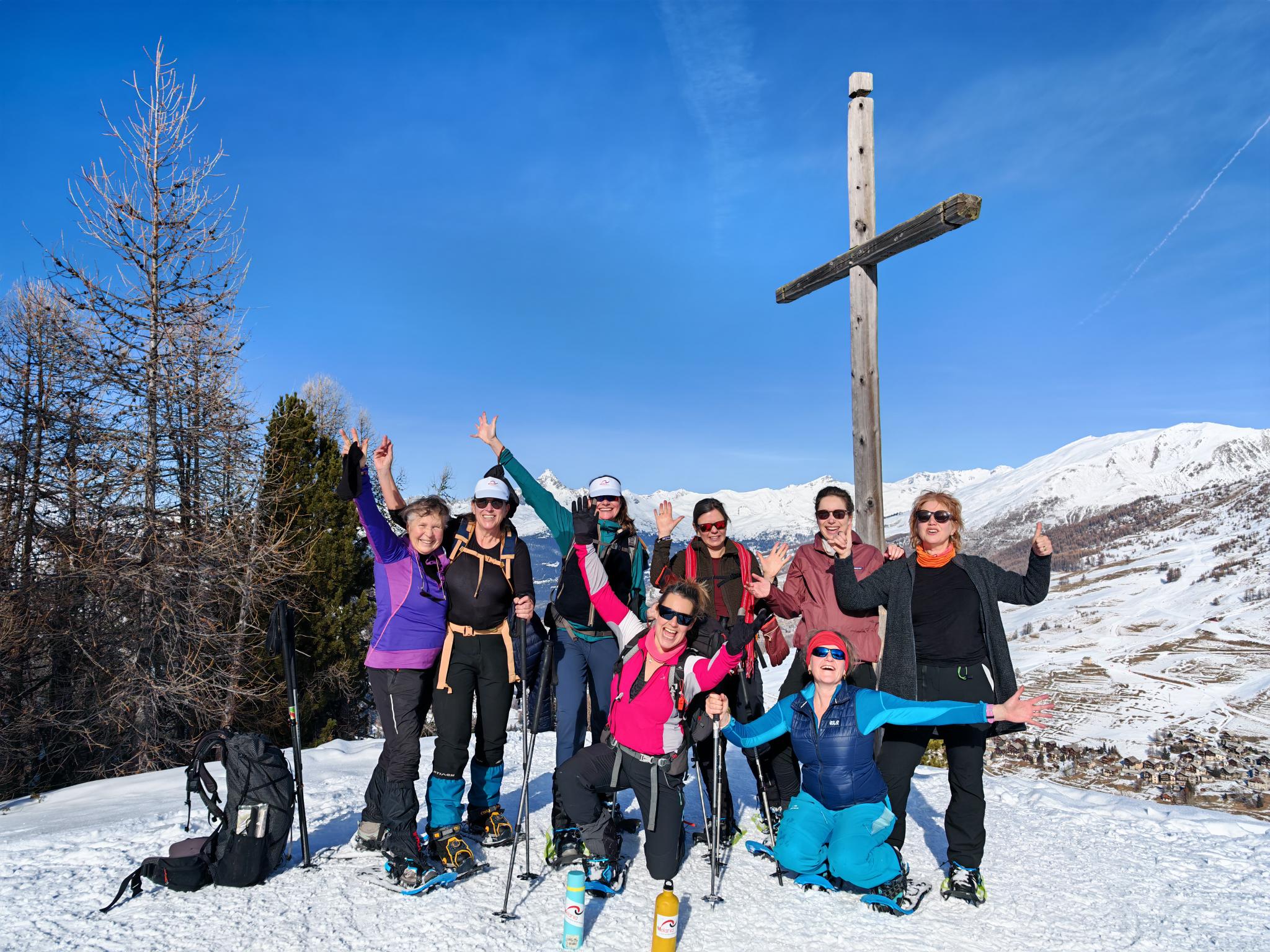 Het was een heerlijke zonnige dag en al snel moesten we afpellen. Meerdere laagjes over elkaar, is het recept voor wandelen in de bergen. Na ongeveer 3 uur wandelen, kwamen we aan bij het kruis. Voor het eerst geen wind op de top en wel zon, dus daar hebben we, na wat fotoshoots, heerlijk in het zonnetje onze lunch opgegeten. De lunch was weer lekker maar helaas kennen de Fransen blijkbaar niet veel variatie aan vegetarisch eten want het was wel de 3e dag achter elkaar dat we couscous mee hadden gekregen.
